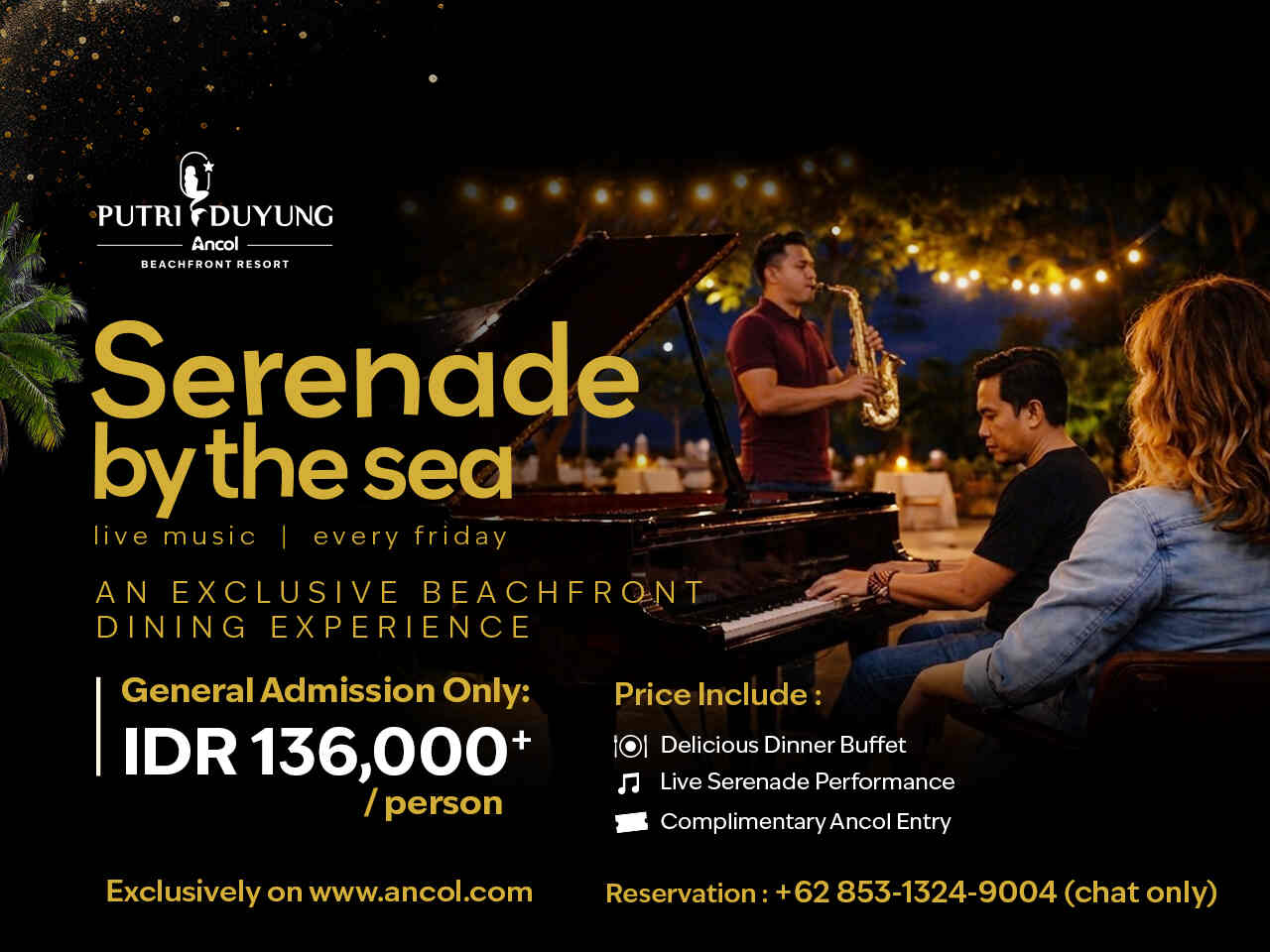 Serenade by the Sea, Putri Duyung Ancol mengundang kamu untuk menikmati sisi lain dari suasana pantai Jakarta yang lebih intim, hangat, dan penuh kenangan. Jadikan malam Jumat kamu lebih spesial dengan pengalaman