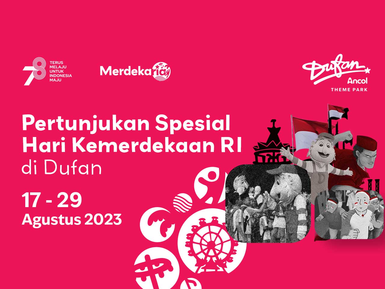 Dufan sebagai salah satu wahana hiburan utama di Jakarta juga merayakan kemerdekaan lewat beberapa kategori acara yang menyenangkan dan meriah. Berikut rangkaian acara yang bisa Anda nikmati di Dufan selama 17 Agustus 2025.