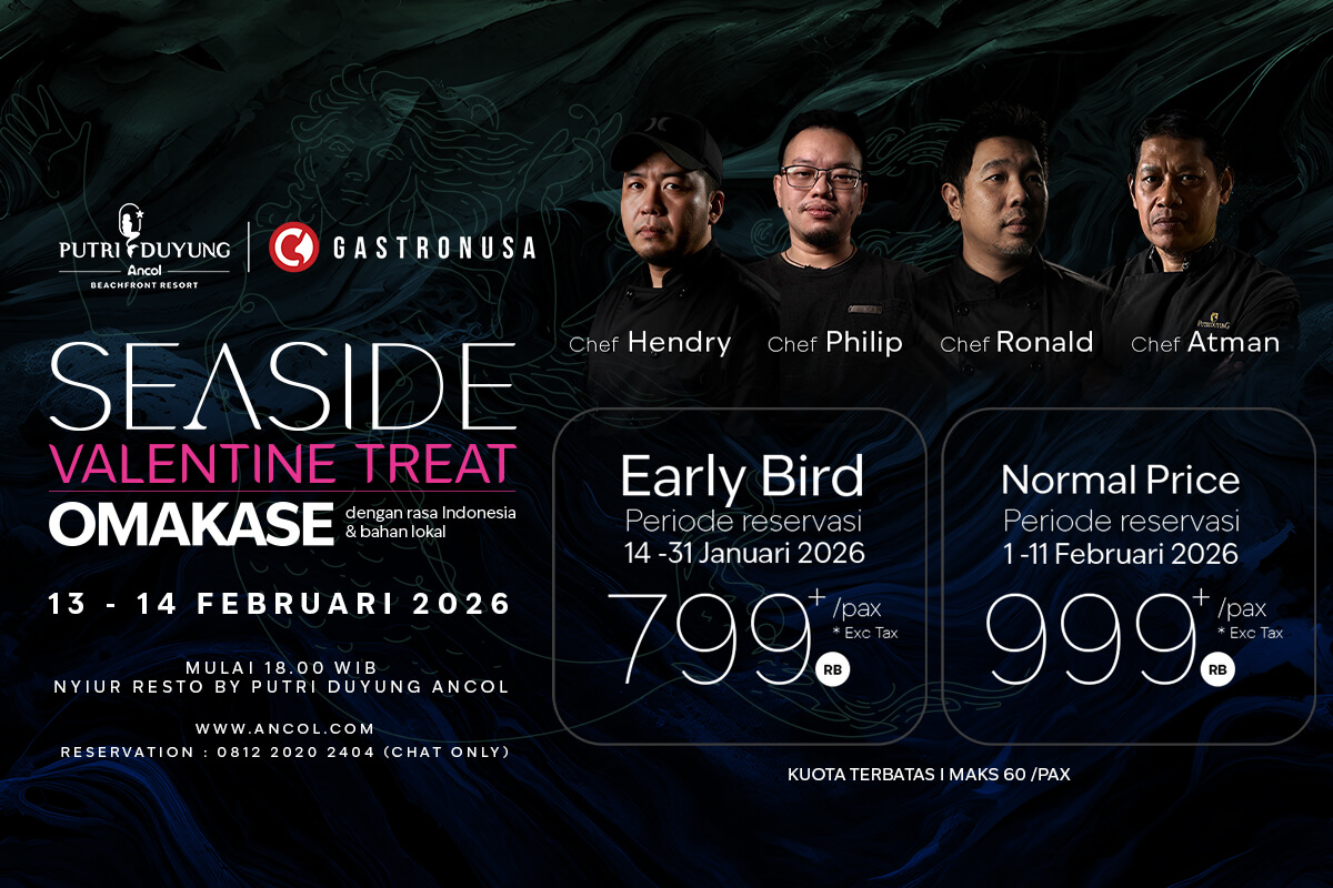 Rayakan hari kasih sayang tahun ini dengan pengalaman yang lebih personal dan eksklusif. Seaside Valentine Treat di Nyiur Resto, Putri Duyung Ancol, menghadirkan makan malam romantis yang mengangkat kekayaan bahan baku terbaik dari laut Ujung Genteng. Lebih dari sekadar makan malam, ini adalah perjalanan rasa mengeksplorasi kelezatan murni dari pesisir Selatan.