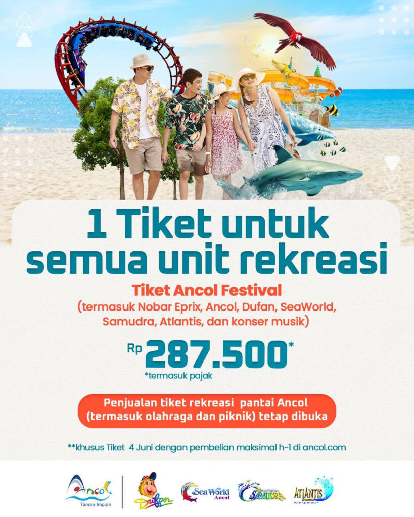 Tiket dengan kategori Ancol Festival seharga Rp.287.500,- (termasuk pajak) tersebut, pengunjung sudah bisa masuk Ancol sekaligus menikmati rekreasi di 4 tempat sekaligus yaitu Dunia Fantasi, Ocean Dream Samudra, Sea World Ancol serta Atlantis Water Adventures khusus di hari itu. Sangat hemat bukan?